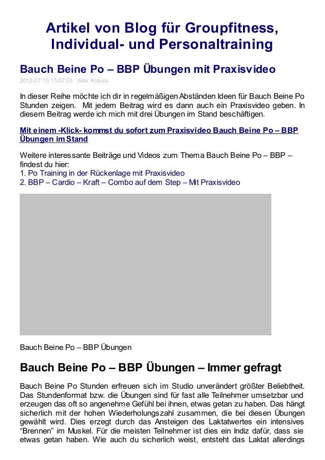 Fitnessprogramme mit dem Titel „Bauch Beine Po“ (abgekürzt BBP) schießen wie Pilze aus dem Boden Die Übungen gegen die ungeliebten Fettzonen sind speziell für Frauen ausgelegt, da sich bei ihnen die überschüssigen Kalorien als Fettpolster bevorzugt im Bereich der Oberschenkel, der Hüften und des Bauches ablagern. FitnessÜbungen für Po und Beine Po und Beinmuskeln werden alltäglich beansprucht wie beim Gehen oder Treppensteigen Die Gesäßmuskulatur ist wichtig für Körperhaltung und Bewegungskoordination Auf vitanetde finden Sie die passenden Übungen. Du verbringst stundenlang auf dem Stepper und dem Laufband, aber irgendwie tut sich da nicht wirklich etwas.