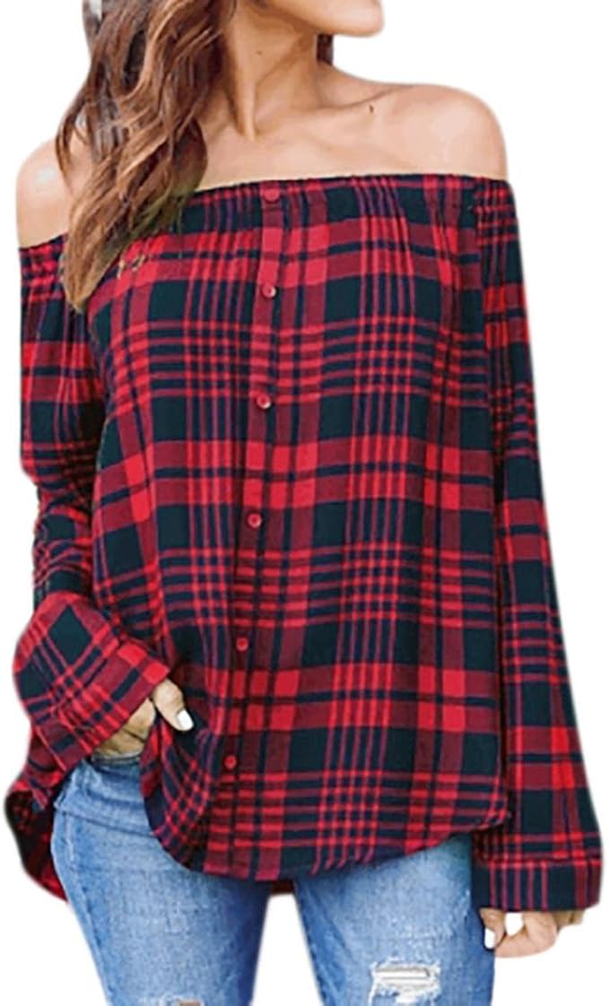 Overdose Frauen Casual Plaid Schulterfrei Langarm Shirt Fruhling Tops Kariertes Sommer Bluse Pulli Oberteil A Red Xl Amazon De Bekleidung
