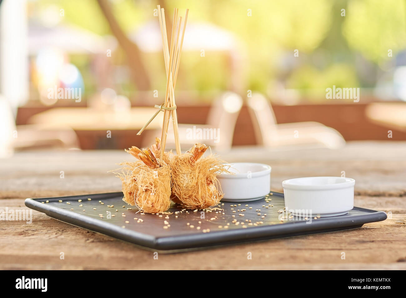 Knusprige Shrimps Auf Unscharfen Hintergrund Garnelen Eingewickelt In Kataifi Teig Leckeres Essen Auf Dem Teller Stockfotografie Alamy