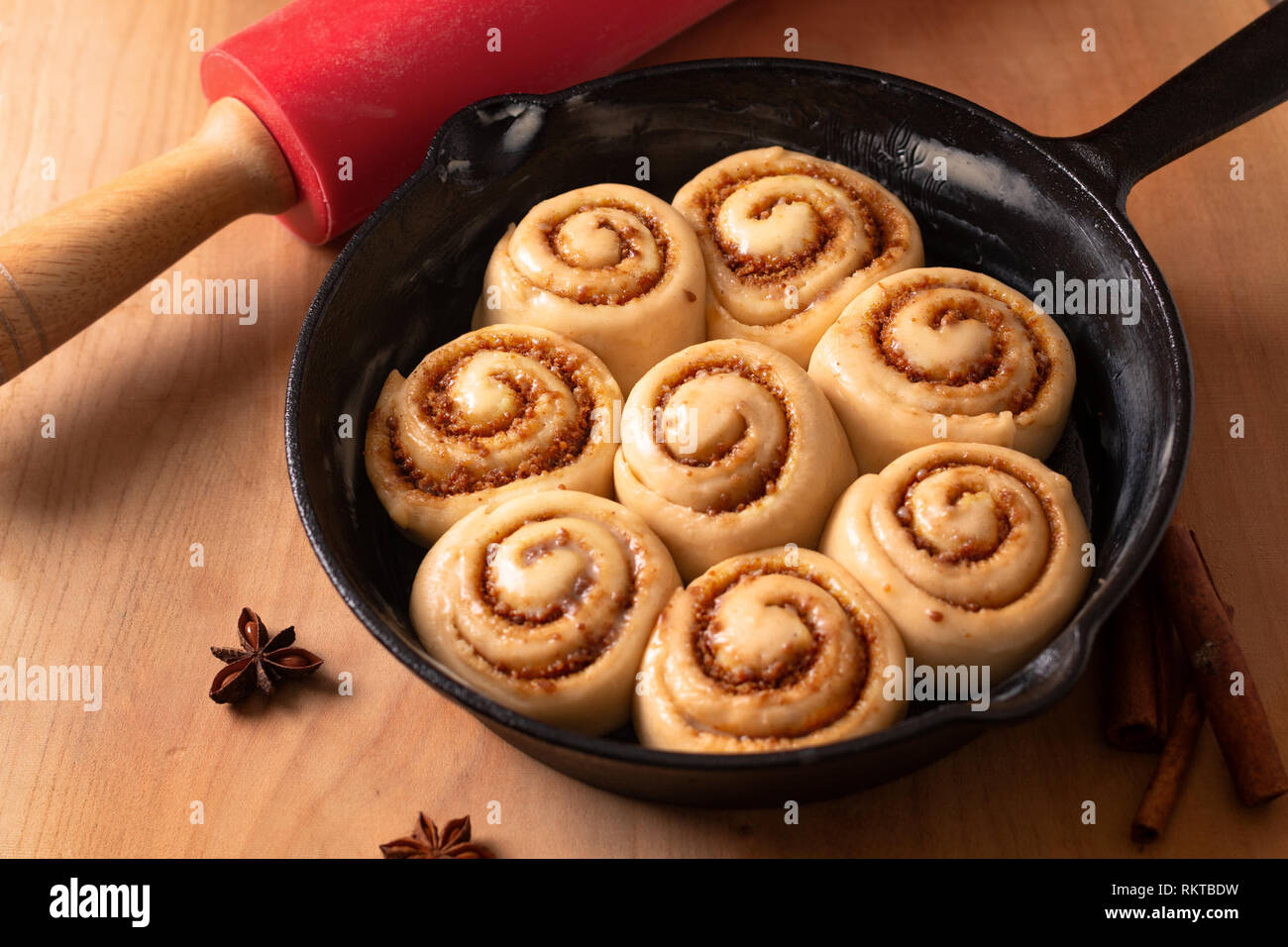 Essen Konzept Geschwollene Teig An Hausgemachten Zimtschnecken Erhoben Vor Dem Backen In Der Pfanne Gusseisen Pfanne Mit Kopie Raum Stockfotografie Alamy