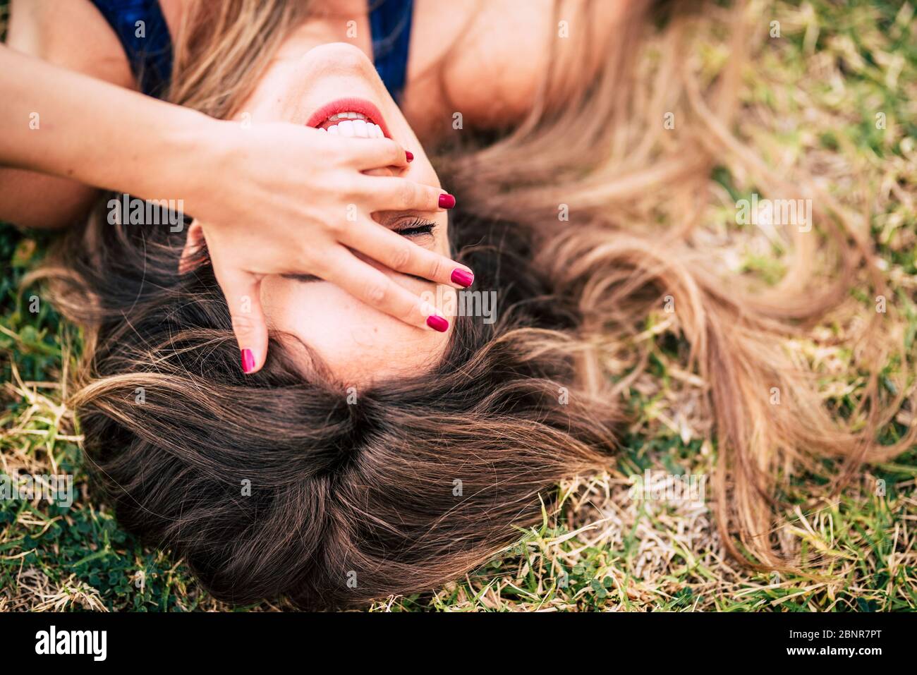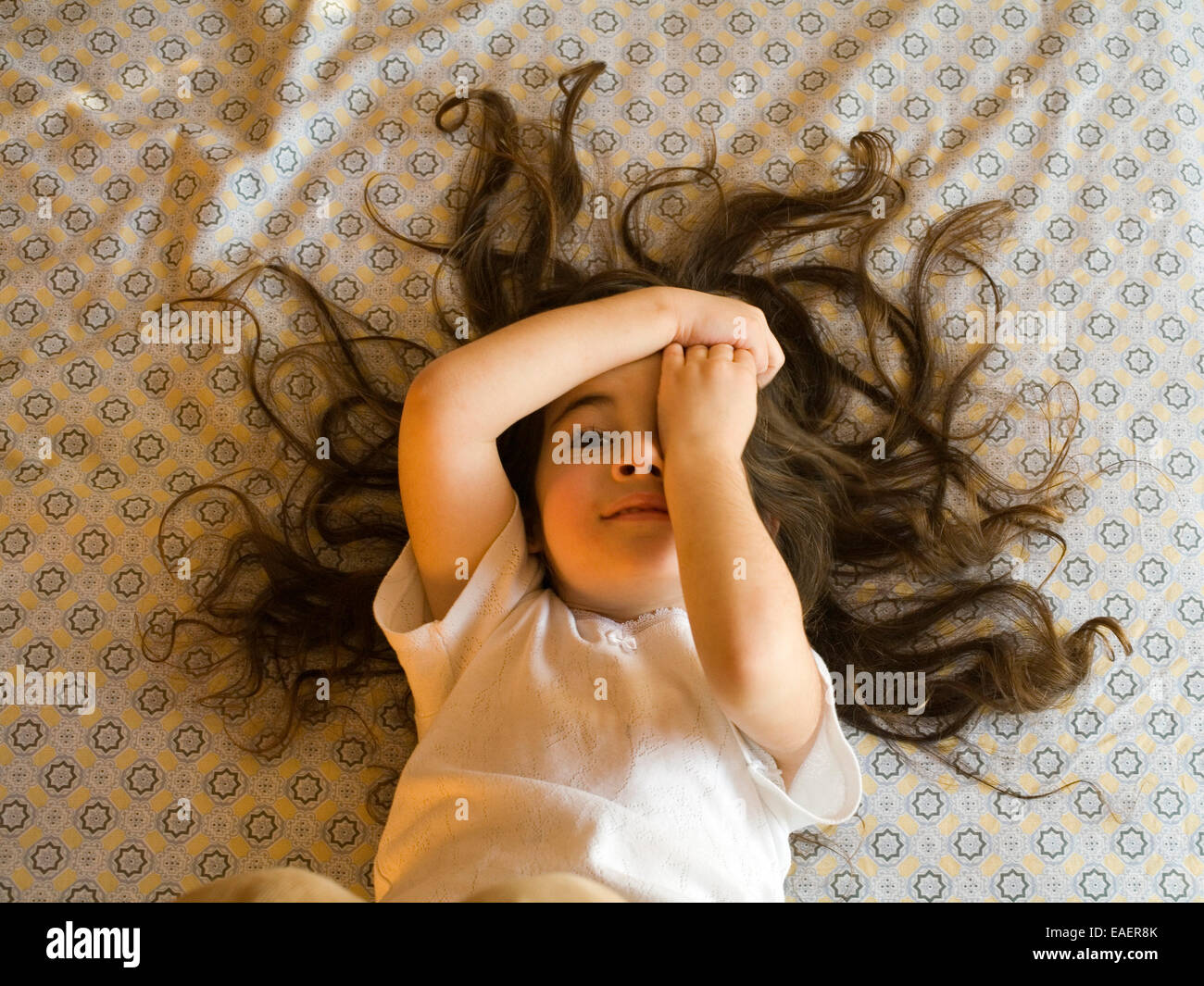 Junge Madchen Mit Viel Haare Macht Ein Lustiges Gesicht Auf Bett Liegend Stockfotografie Alamy