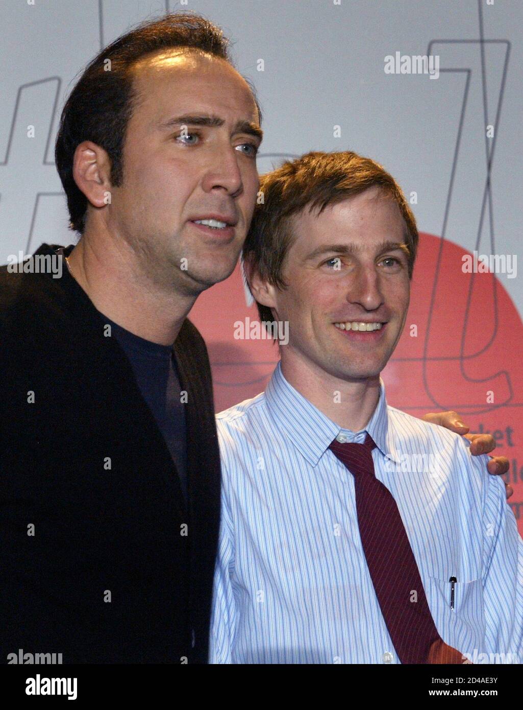U S Actor Nicolas Cage And Director Jonze Smile During News Conference At Berlinale Filmfestival In Berlin Stock Photo Alamy