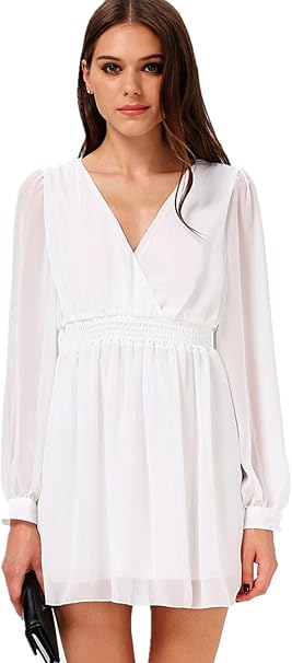Sheinside Damen Weisses Langarm V Ausschnitt Kleid Mit Gurtel Xl Weiss Amazon De Bekleidung