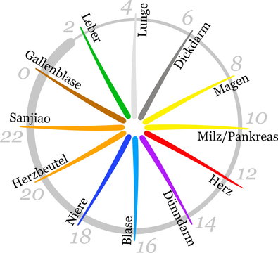 Aufgaben der Leber aus TCMSicht In der TCM hat die Leber nicht so sehr Entgiftungs und Umwandlungsfunktion wie in der westlichen Medizin Vielmehr ist sie für die Energieverteilung im Körper zuständig Die wichtigste Aufgabe ist das Speichern des Blutes und die Gewährleistung, dass „alles“ fließt. Organuhr (TCM) Organuhr ist ein Begriff aus dem Bereich der traditionellen chinesischen Medizin (TCM)) Der Begriff bezeichnet die Vorstellung, dass der menschliche Körper einem täglichen Energiekreislauf unterliege, der zu zyklisch wiederkehrenden eszeiten in bestimmten Funktionskreisen (Organsystemen) (Meridianen) einen durch besondere Aktivität dieses Funktionskreises (Organsystems. In der Lehre der traditionellen chinesischen Medizin darf die Organuhr nicht fehlen Die Organuhr wird meistens in einer 12 bzw 24 Stundenuhr dargestellt Dabei hat jedes Organ zu bestimmten Zeiten eine aktive bzw eine passive Phase Wacht man beispielsweise jede Nacht zwischen 1 und 3 Uhr auf, kann es sein, dass man Probleme mit der Leber hat, denn die hat dann ihre aktive Phase.