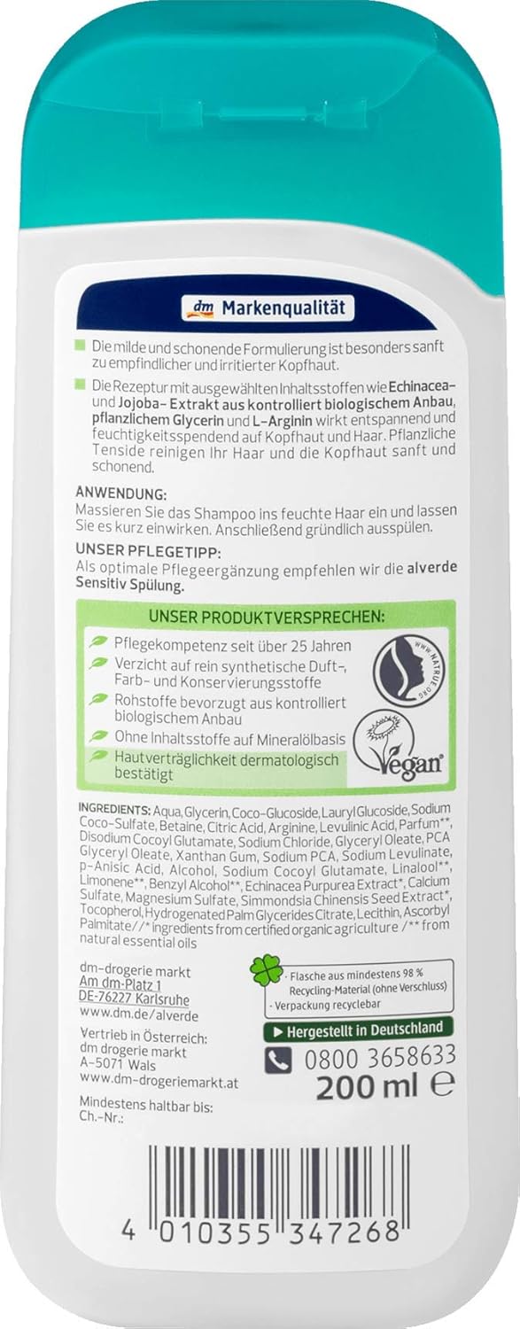 Alverde Sensitiv Organic Shampoo For Sensitive And Irritated Scalp 0 Ml With Echinacea And Jojoba Extract Amazon Co Uk Beauty