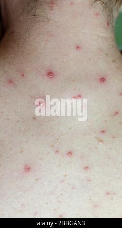 Grosse Flecken Und Pickel Akne Auf Dem Korper Erwachsener Korper Mit Windpocken Mann Mit Chickenpocken Varicella Varicella Zoster Virus Stockfotografie Alamy