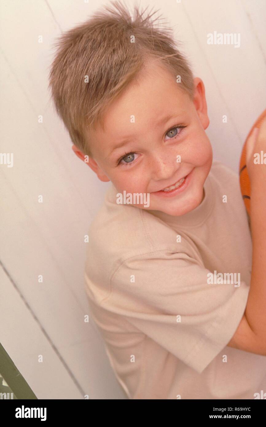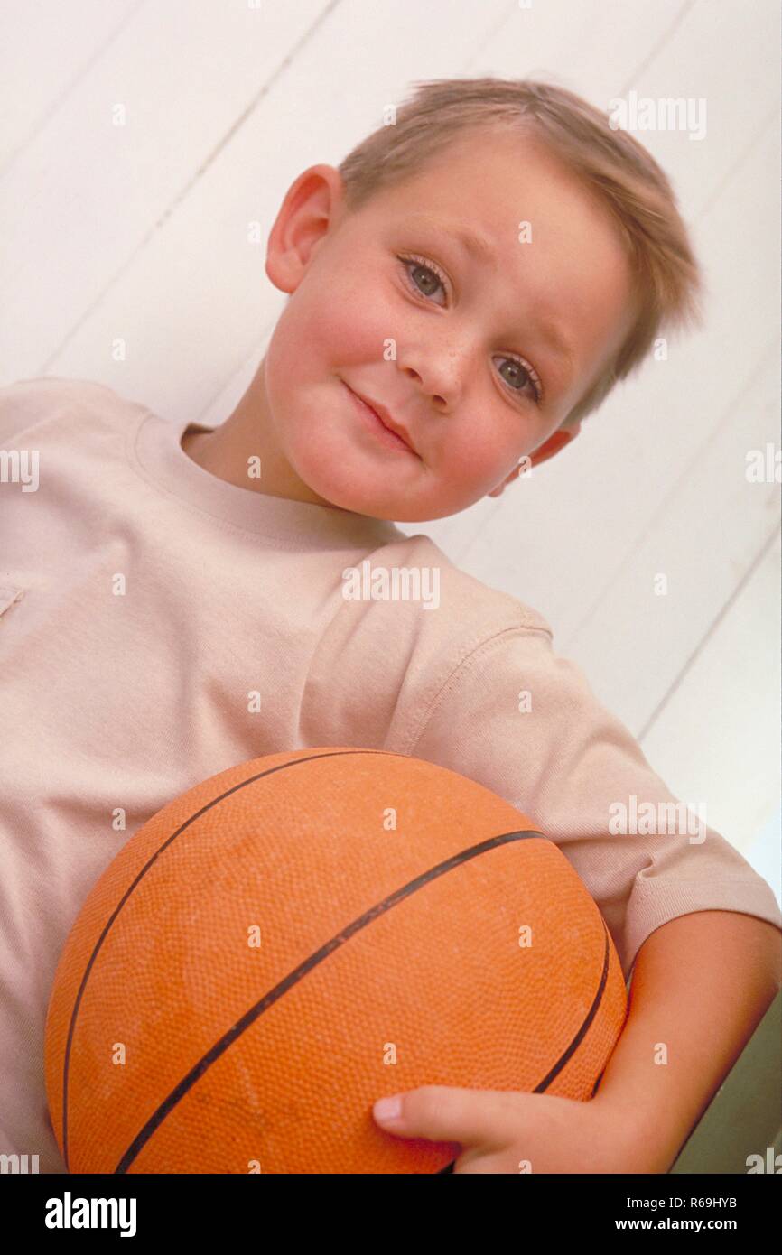 Portrait Halbfigur 6 Jaehriger Froehlicher Blonder Junge Bekleidet Mit Beigem T Shirt Vor Weisser Bretterwand Mit Orangem Basketball Unter Dem Arm Stock Photo Alamy