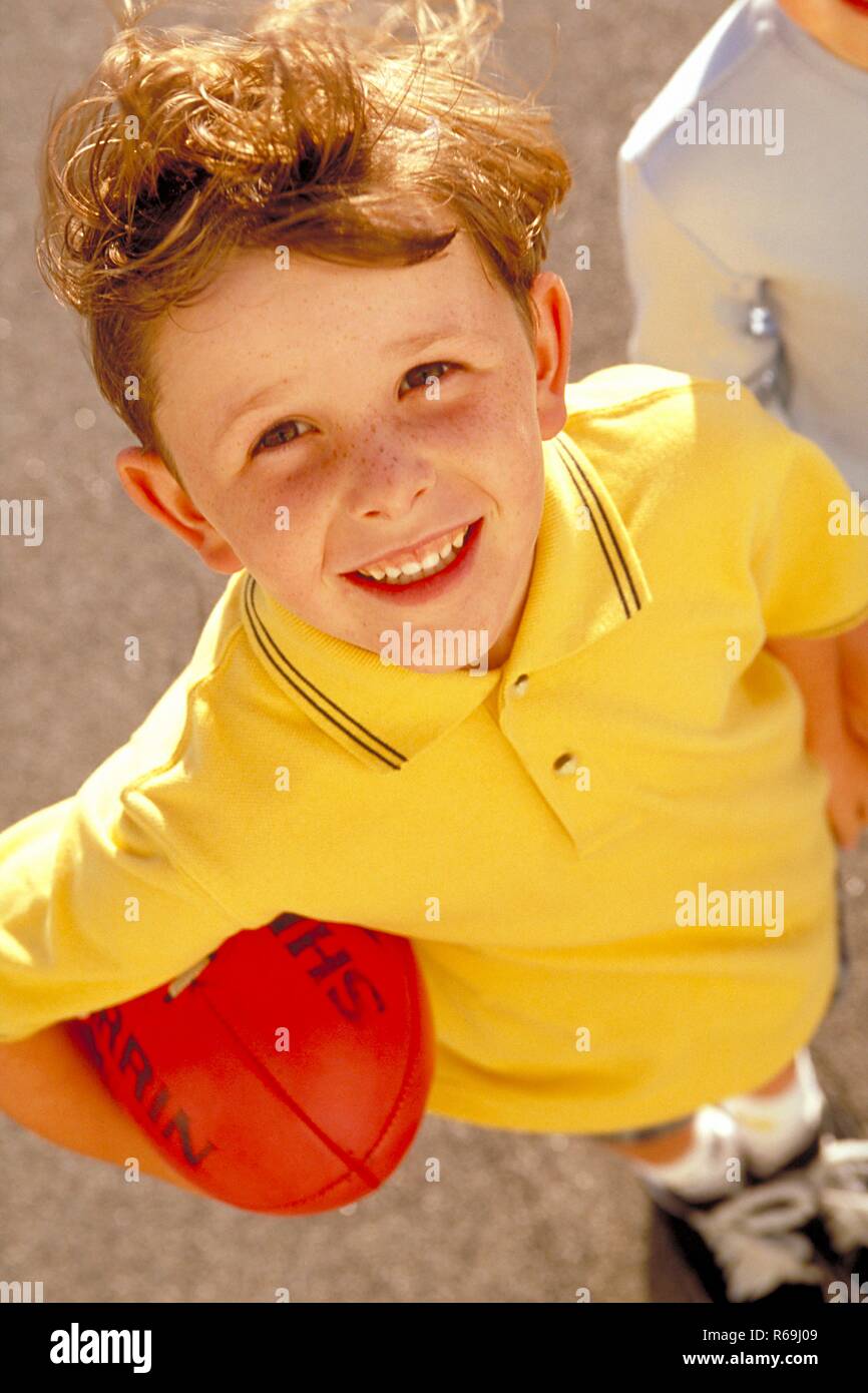 Portrait Ganzfigur Froehliecher Sommersprossiger Junge Mit Braunen Haaren Bekleidet Mit Gelbem T Shirt Im Alter Von 6 Jahren Auf Der Strasse Mit Orangem Rugby Ball Unter Dem Arm Stock Photo Alamy
