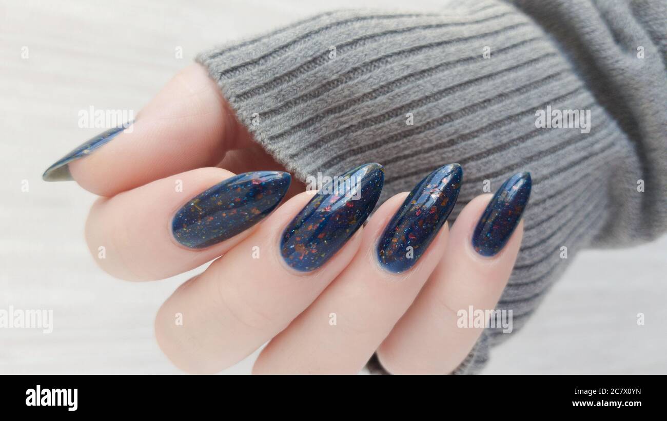 Gel Hybrid Manikure Konzept Blonde Frau Blick Auf Ihre Blau Bemalte Lange Schone Nagel Lizenzfreie Fotos Bilder Und Stock Fotografie Image