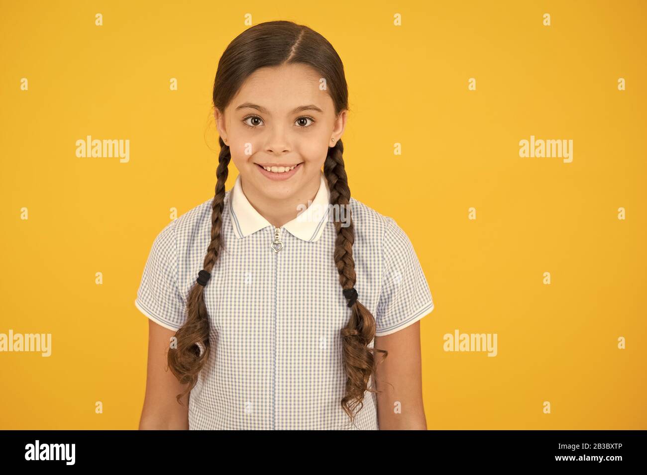 Susse Zopfe Madchen Mit Geflochtenem Haar Stil Friseur Ausschreibung Schulmadchen Auf Gelben Hintergrund Ordentliche Frisur Kleines Madchen Mit Niedlichen Zopfen Schone Zopfe Geflochtene Frisur Konzept Stockfotografie Alamy