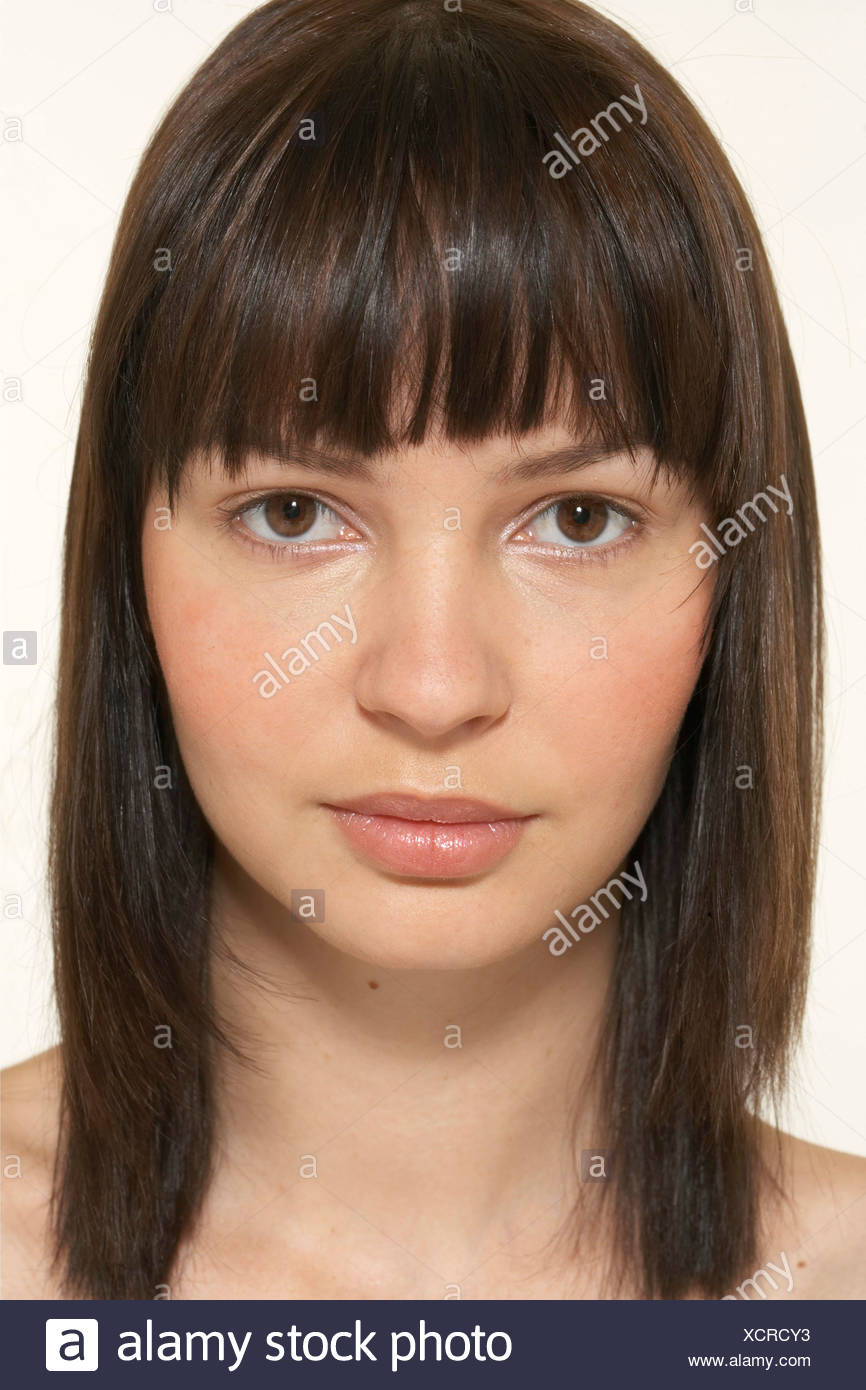 Schuss In Den Kopf Der Brunette Frauen Mit Fransen Haare Metallische Lidschatten Und Glanzende Lippen Auf Der Suche Direkt Auf Kamera Weisser Hintergrund Stockfotografie Alamy