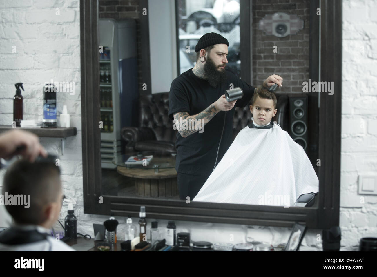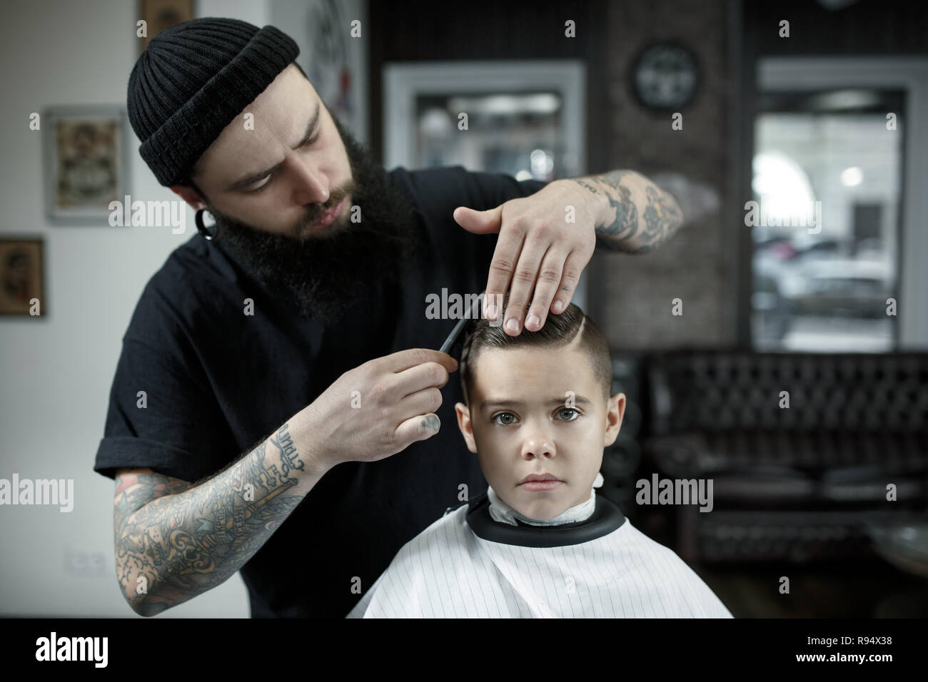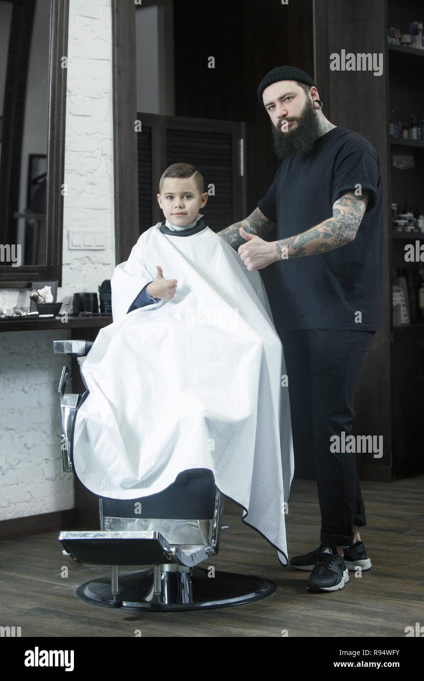Kinder Friseur Schneiden Kleiner Junge Vor Einem Dunklen Hintergrund Zufriedene Cute Vorschuler Boy Die Haare Schneiden Lassen Die Hand Des Meisters Haben Tattoo Mit Dem Wort Rasur Stockfotografie Alamy