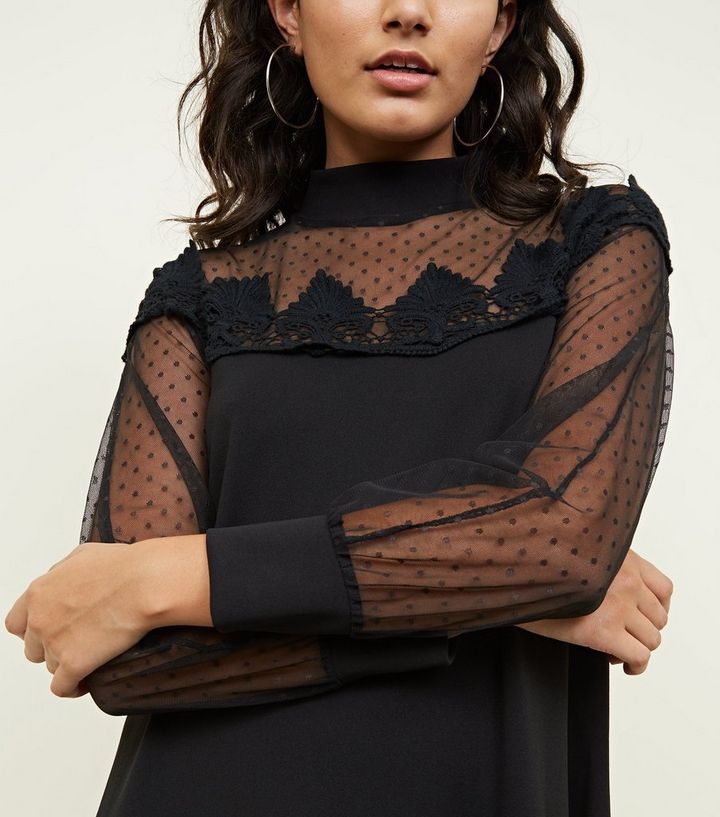 Mela Schwarzes Kleid Mit Armeln Und Passe Aus Netzstoff New Look