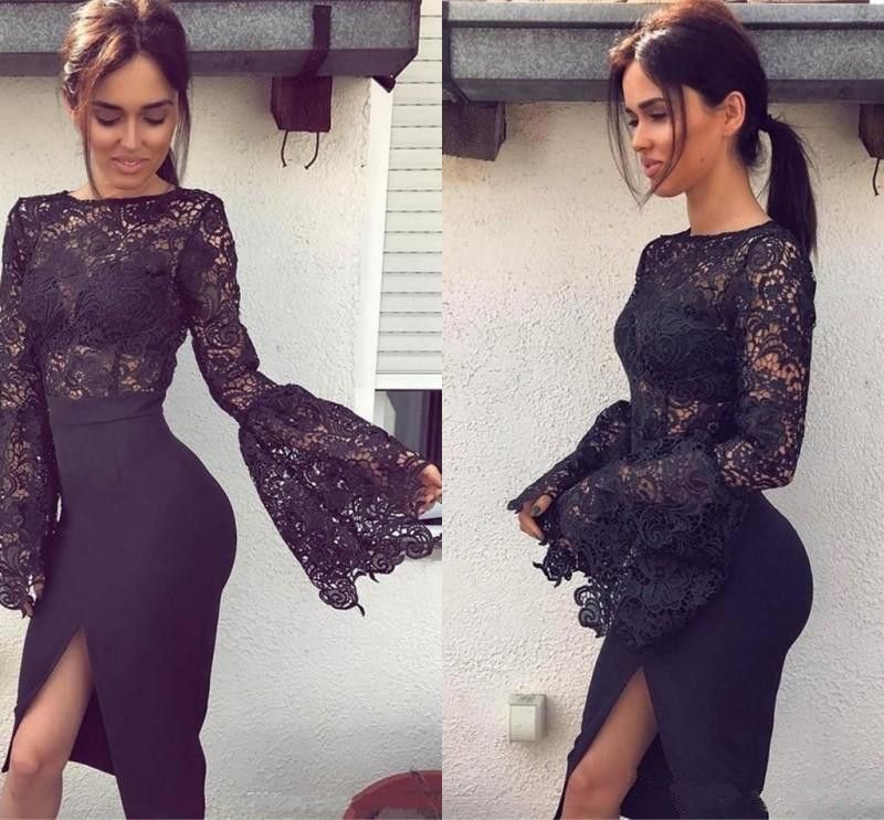 Grosshandel Sexy Schwarzen Langen Armeln Prom Kleider Vorne Split Trompete Armel Spitze Meerjungfrau Kleider Abendgarderobe Durchsichtig Knielangen Billig Partykleid Von Hongjinghao 91 74 Auf De Dhgate Com Dhgate