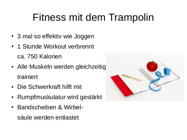 Ein Trainingsgerät, das so locker und leichte Bewegungen ermöglicht wie das bellicon® Minitrampolin, bringt die gesamte Familie in Schwung und dient als. Das Training mit dem Trampolin ist mehr als nur einfaches Springen Im Vergleich, verbrennt man beim Joggen ca 500 Kalorien pro Stunde Bei gleicher Intensität verbraucht der Körper auf dem Trampolin ca 750 Kalorien Du kannst beim Training auf dem Trampolin bis zu 3 mal mehr Kalorien verbrennen als beim Joggen. Jumping Fitness effektiver als Joggen 18 Bewertungen Laut einer im International Journal of Sports Science veröffentlichten Studie ist Trampolinspringen hinsichtlich der Verbesserung der aeroben Fitness doppelt so wirksam und bei der Fettverbrennung 50% effizienter als Laufen.