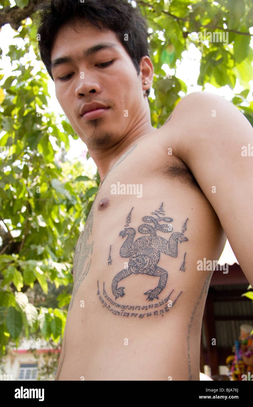 Eine Jungen Mannes Brust Tattoos Im Tempel Wat Bang Phra In Thailand Wo Monche Ihre Anhanger Mit Gebeten Tatowieren Stockfotografie Alamy