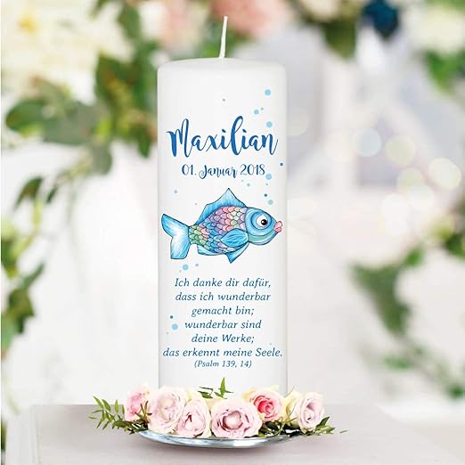 Taufkerze Blauer Regenbogen Fisch Mit Wunschdaten Kerze Zur Taufe Geburt Oder Kommunion 25 X 8 Cm Ohne Patenkerze Junge Mit Taufspruch Wie Abgebildet Amazon De Kuche Haushalt