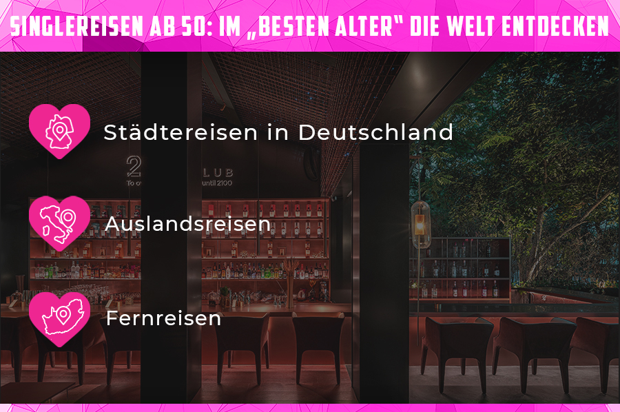 Städtereise Fernreise Kreuzfahrt ab 30, 40, 50 Jahren. Werfen Sie einen Blick in unsere attraktiven Reiseangebote für Singles ab 50 Lassen Sie sich von den schönsten Reisedestinationen in. Singlereisenab50de ist eine Single und Reisecommunity mit Herz, aber auch fürs Herz Vielleicht ist unter den Reisepartnern oder Freizeitpartnern ja der Traummann oder die Traumfrau dabei Auf Reisen und bei gemeinsamen Unternehmungen lernt man sich besser kennen und da ist es nicht ausgeschlossenen, dass der Funke überspringt.