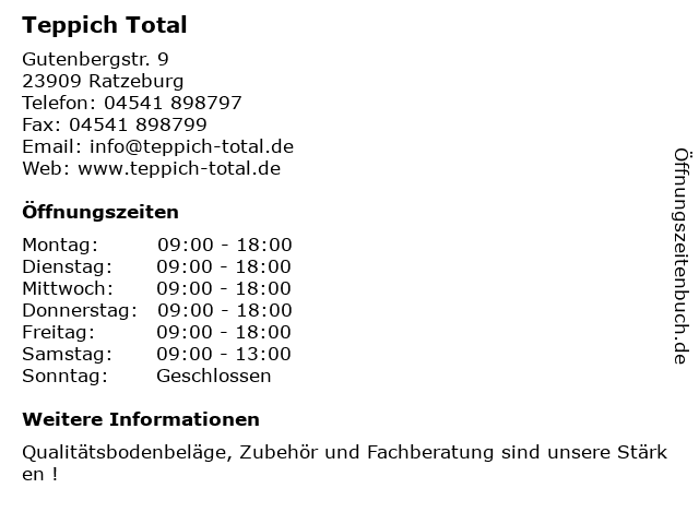 Teppich Total Bodenbelage Offnungszeiten In Ratzeburg Gutenbergstr 9 Findeoffen Deutschland