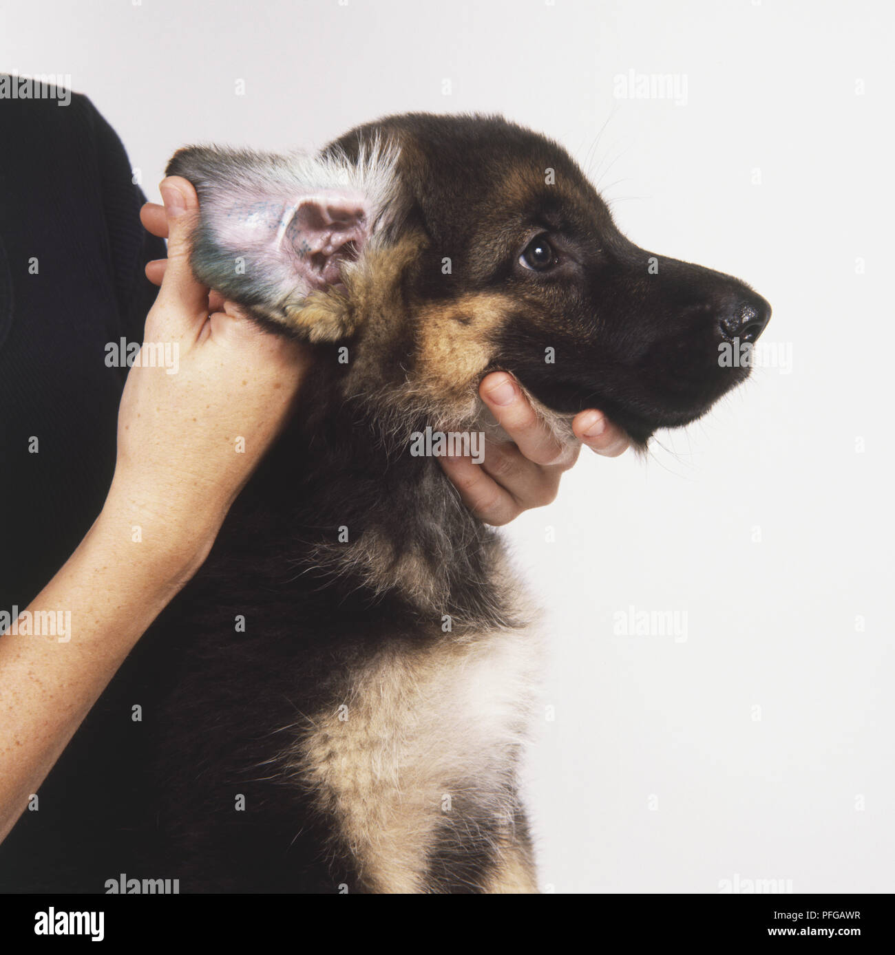 Ohr Des Deutschen Schaferhund Welpe Canis Familiaris Angehoben Wird Tattoo Auf Der Innenseite Zu Offenbaren Seitenansicht Stockfotografie Alamy