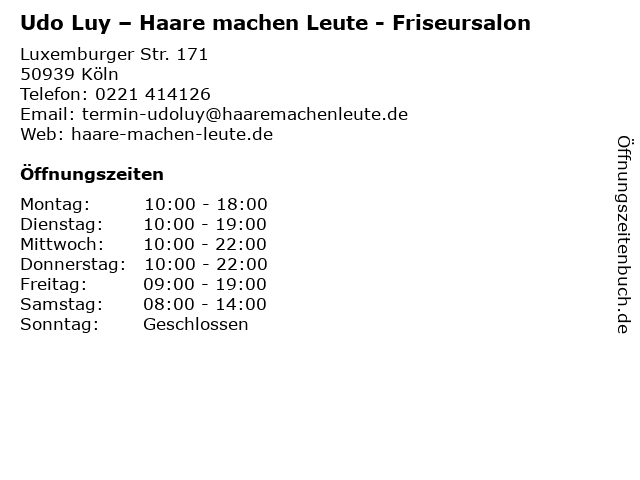 Find the best Hair Salons on Yelp search reviews of 1321 Cologne businesses by price, type, or location. Directors / Officers RalfUdo Luy, geschäftsführer, 10 Jan 17. Udo Luy Haare machen Leute Luxemburger Straße 171 Köln T 02 21 / 41 41 26 USt ID Nr DE 154 090 660 Mitglied der Handwerkskammer Köln Haftungsausschluss 'Udo Luy Haare machen Leute' (der Autor) übernimmt keinerlei Gewähr für die Aktualität, Korrektheit, Vollständigkeit oder Qualität der bereitgestellten Informationen.