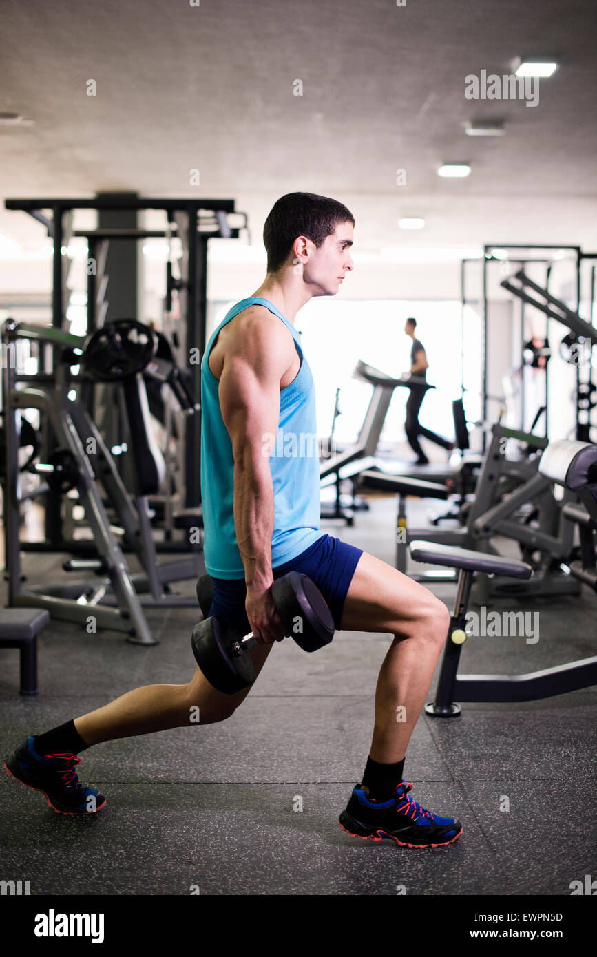 Junger Mann Beine Und Bizeps Ubungen Mit Hanteln Im Fitnessstudio Mit Ambient Ligh Stockfotografie Alamy