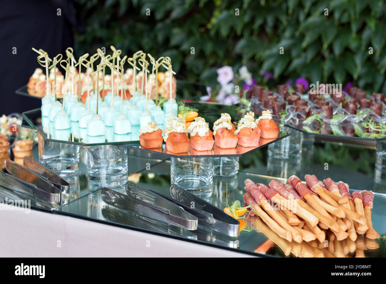 Happchen Fingerfood Party Food Slider Canape Tapas Tabelle Serviert Im Sommer Terrasse Cafe Catering Service Restaurant Im Freien Tisch Mit Essen Stockfotografie Alamy