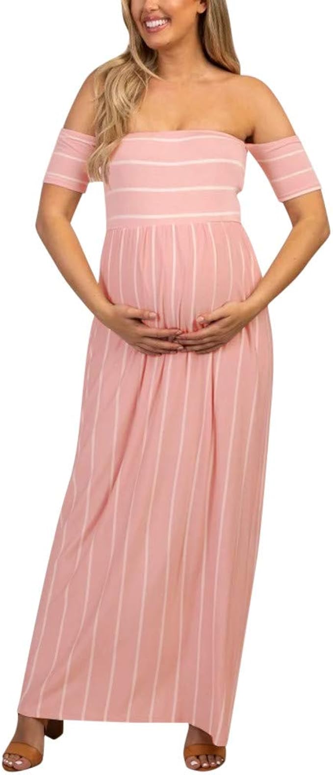 Huhu3 Schwangerschafts Kleid Frauen Kurzarm Schulterfrei Streifen Elegant Sommer Maxikleid Umstandskleid Festlich Mutterschaft Freizeit Langes Kleid Amazon De Bekleidung