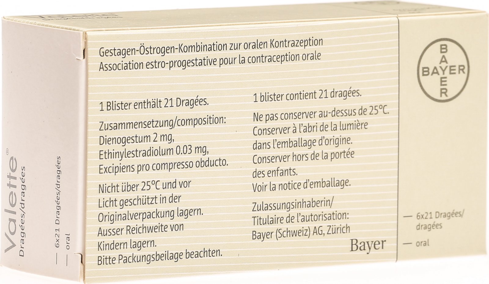 Wirkstoff Dienogest und Ethinylestradiol (G03AA16) GTIN Code Details Auf Verschreibung des Arztes oder der Ärztin Valette ist ein Arzneimittel zur hormonalen Empfängnisverhütung, ein sogenanntes kombiniertes hormonales Kontrazeptivum (CHC) bzw die «Pille».