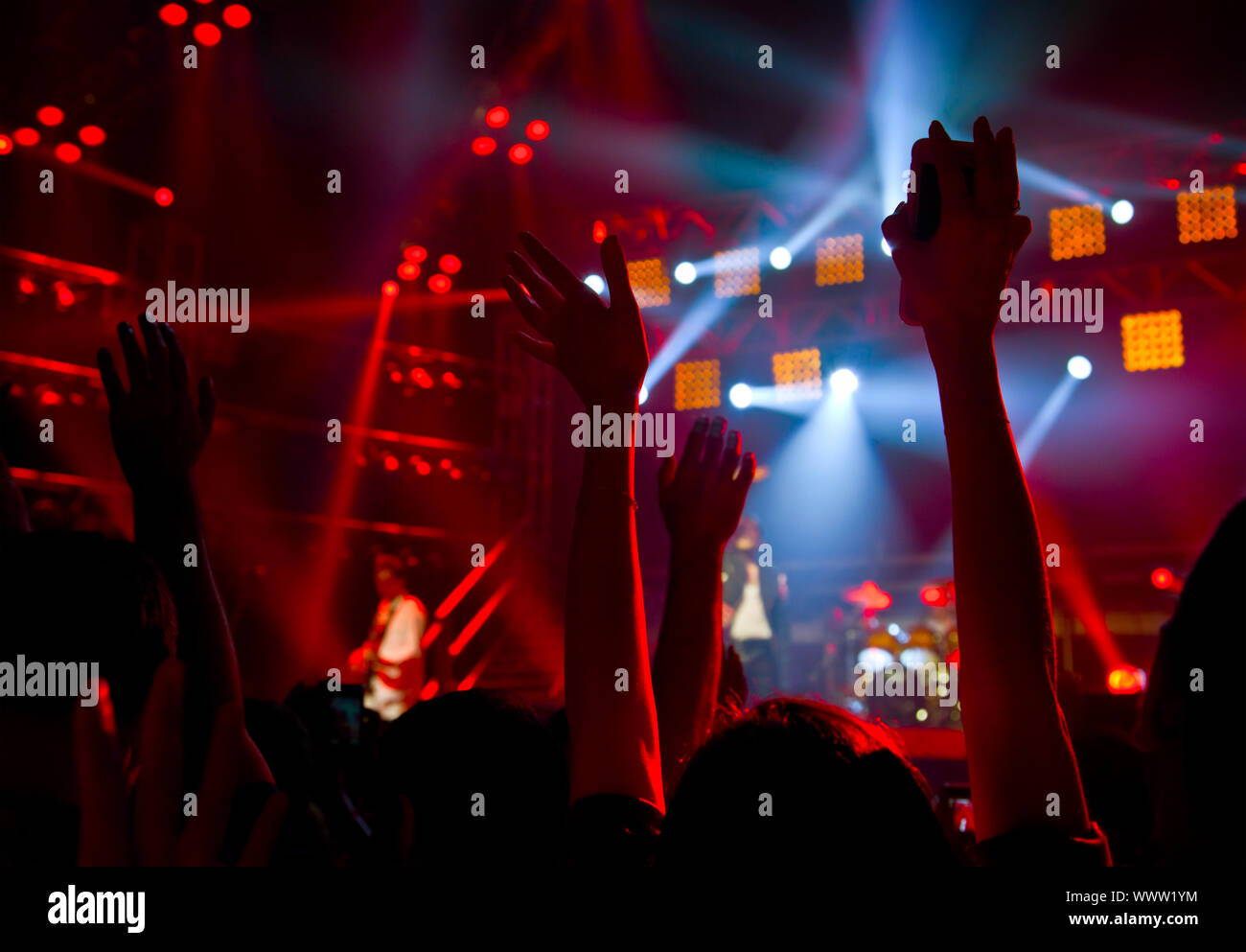 Disco Party Konzert Mit Grossen Gruppe Von Happy Tanzende Menschen Silhouette Der Hande In Der Luft Uber Blur Rot Bunte Buhne Leuchten Aktiven Lebensstil Stockfotografie Alamy