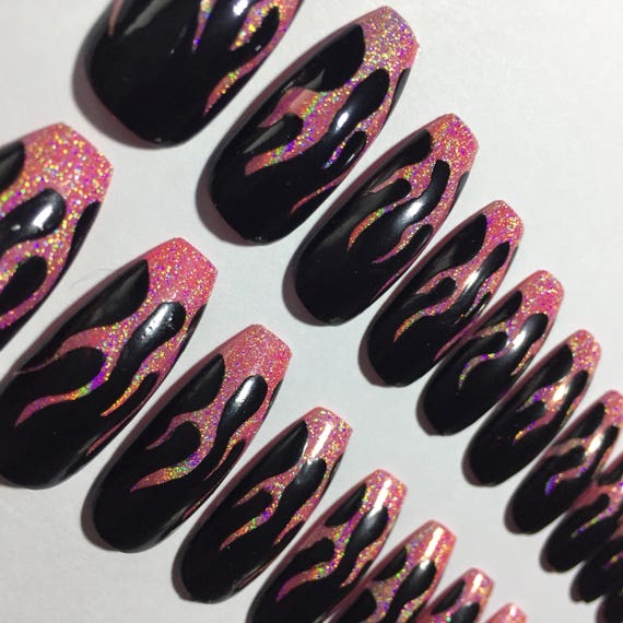 Rosa Und Schwarz Holographische Flamme Falsche Nagel Etsy