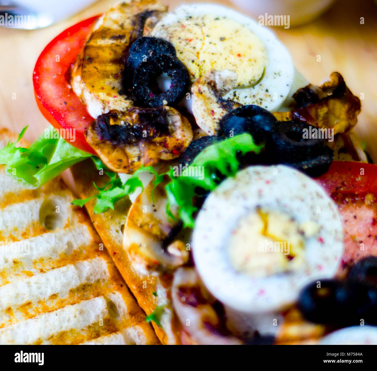 Gegrilltes Sandwich Mit Verschiedenen Aufschnitt Kase Pilze Tomaten Und Eier Leckeren Und Gesunden Snacks Warme Kuche Stockfotografie Alamy