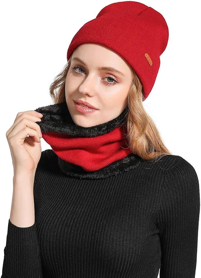 Gkmamrg Strickmutze Wintermutze Schal Set Mit Fleecefutter Ski Set Rot Slouch Beanie Mutze Loop Schal Fur Damen Frauen Madchen Amazon De Bekleidung