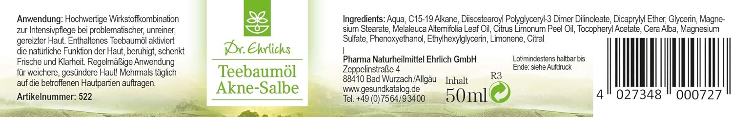 Dr ehrlichs teebaumöl aknesalbe inhaltsstoffe / dr ehrlichs teebaumöl aknesalbe ingredients aqua, isopropyl palmitate, paraffinum liquidum, polyglyceryl2 sesquiisostearate, paraffin, glycerin, magnesium stearate, cera alba, cera microcristallina, melaleuca alternifolia leaf oil, citrus medica limonum peel oil, aluminum distearate, tocopheryl acetate, phenoxyethanol, magnesium sulfate, ethylhexylglycerin, linalool, limonene, citral.