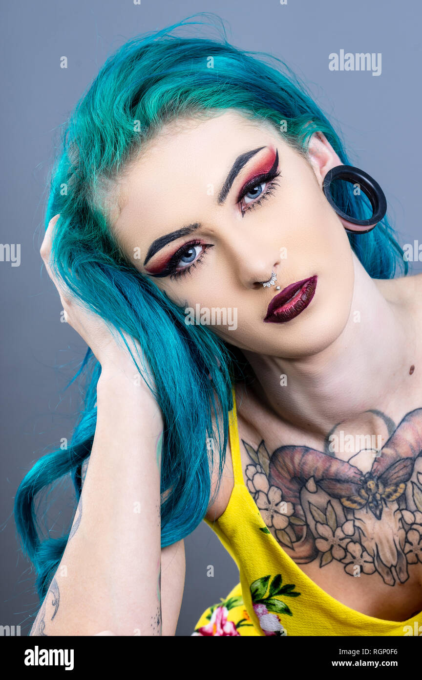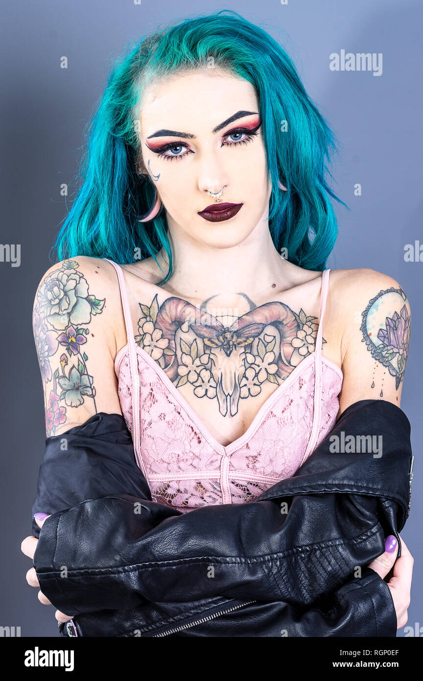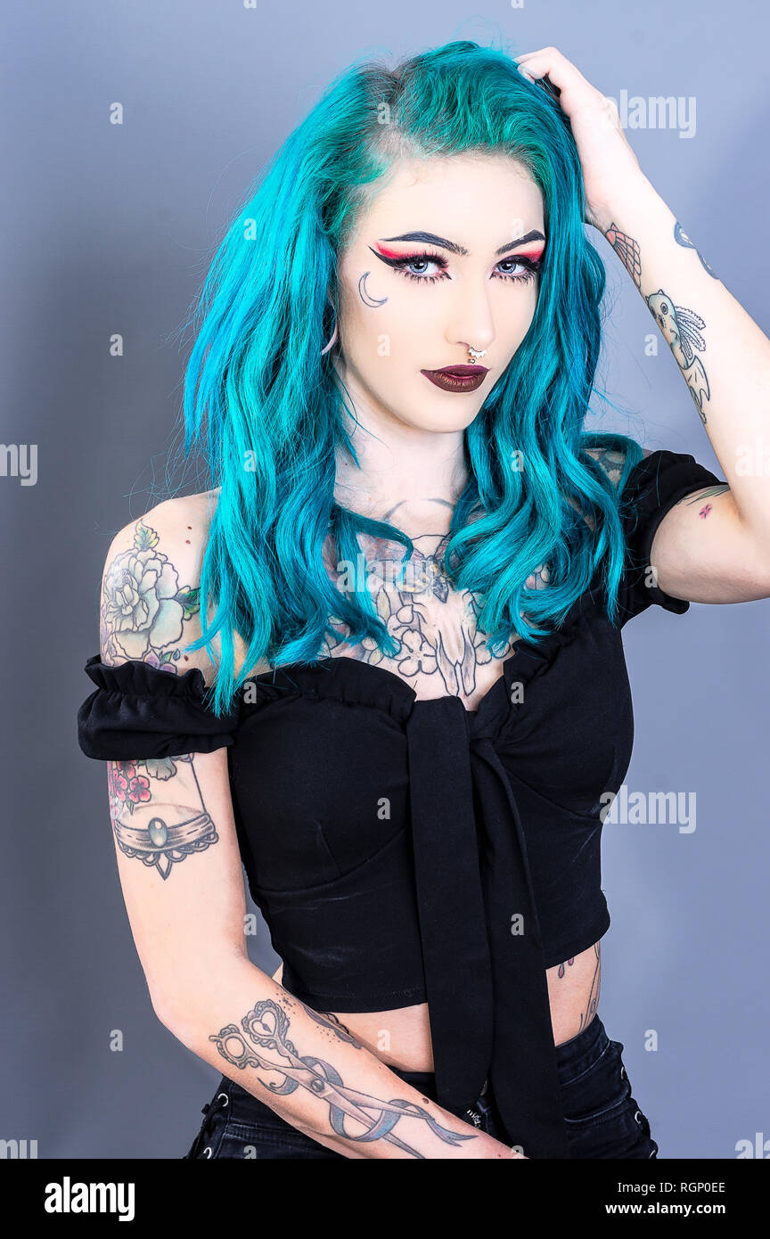 Portrait Von Ein Attraktives Madchen Mit Blauen Haaren Und Tattoos Stockfotografie Alamy