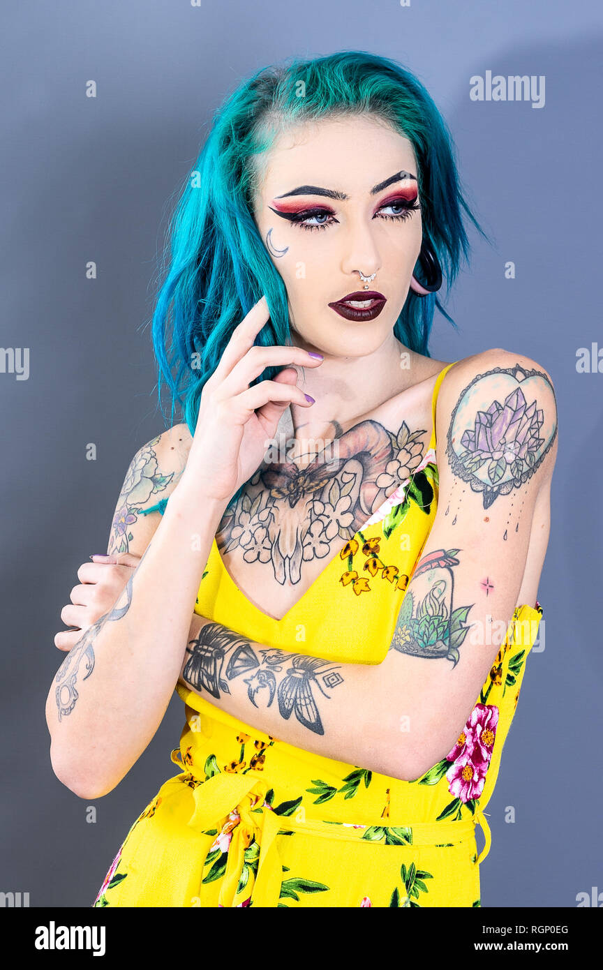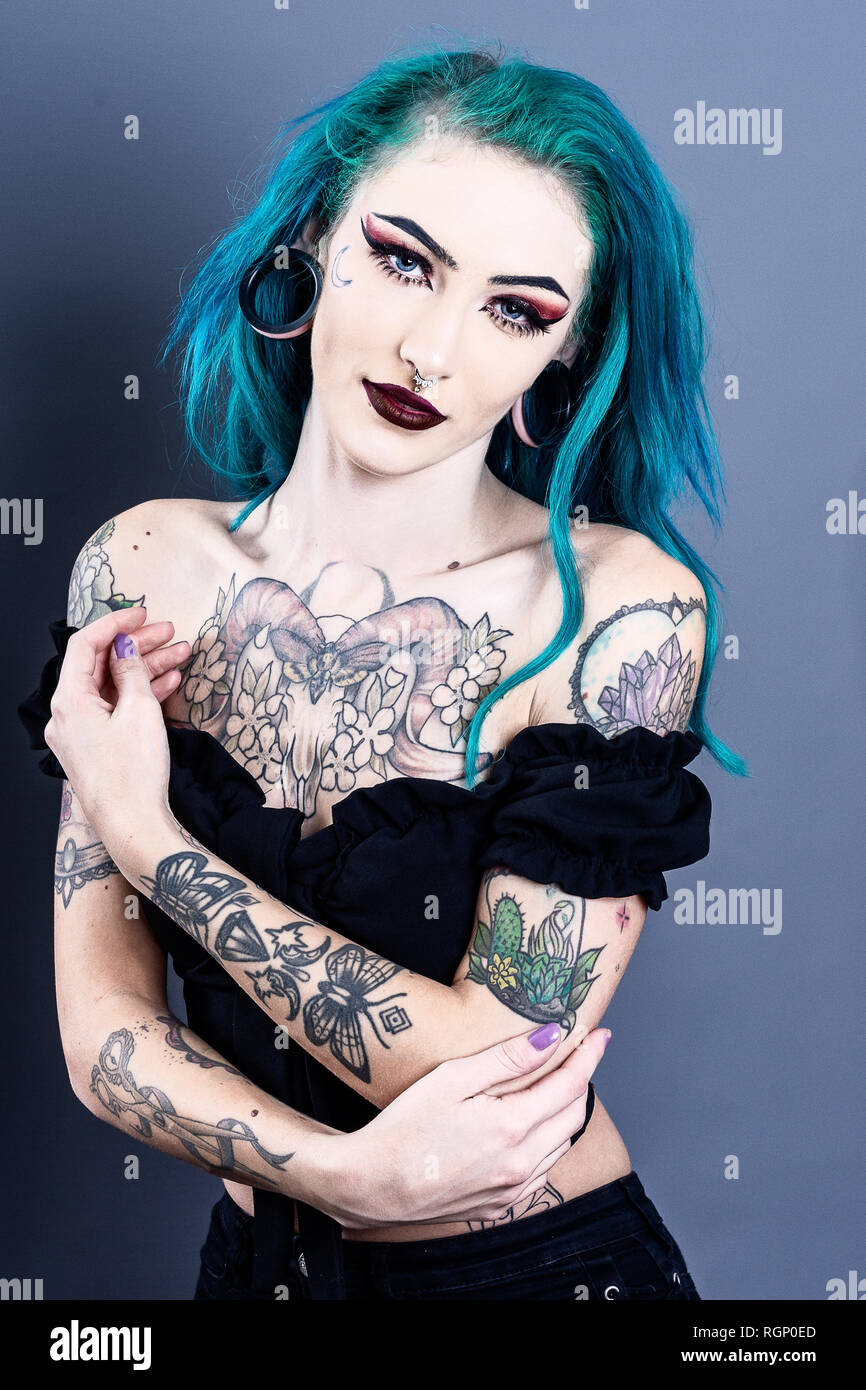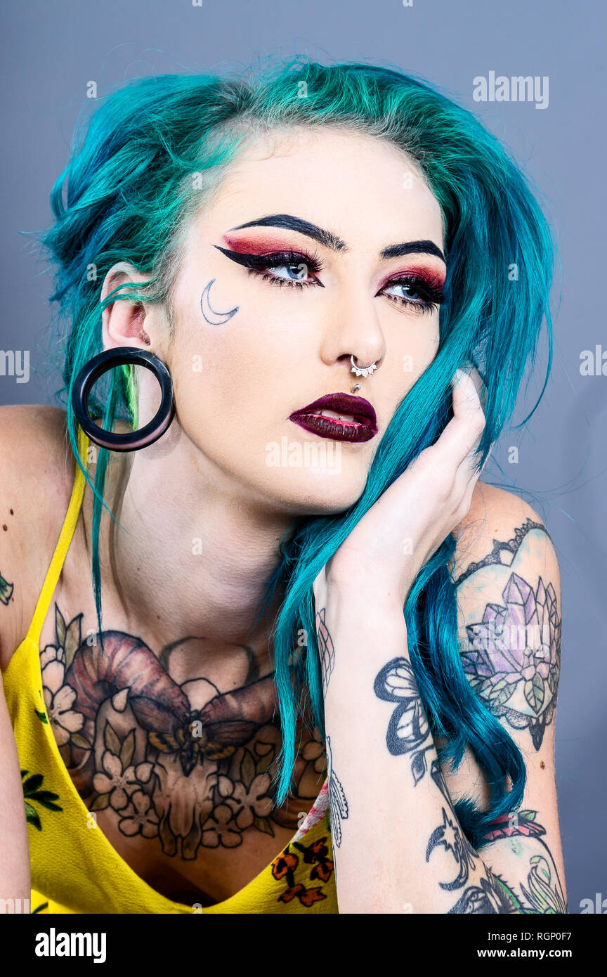 Portrait Von Ein Attraktives Madchen Mit Blauen Haaren Und Tattoos Stockfotografie Alamy