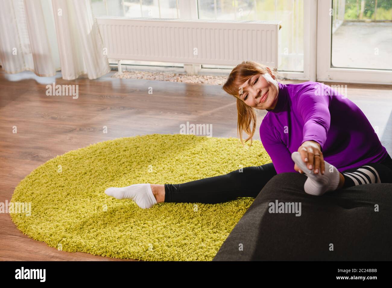 Aged Woman Pensioner Make Workout Stretching Exercise At Home Sofa And Carpet Wearing Sport Leggings And Purple Top Active Retirement Lifestyle Stock Photo Alamy