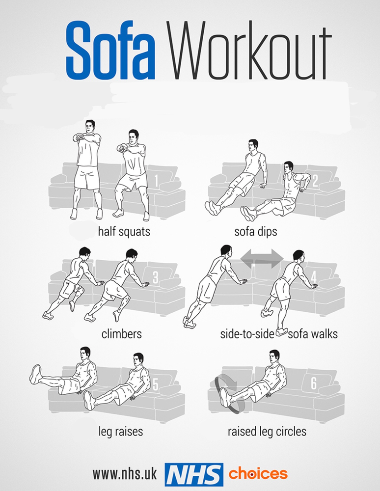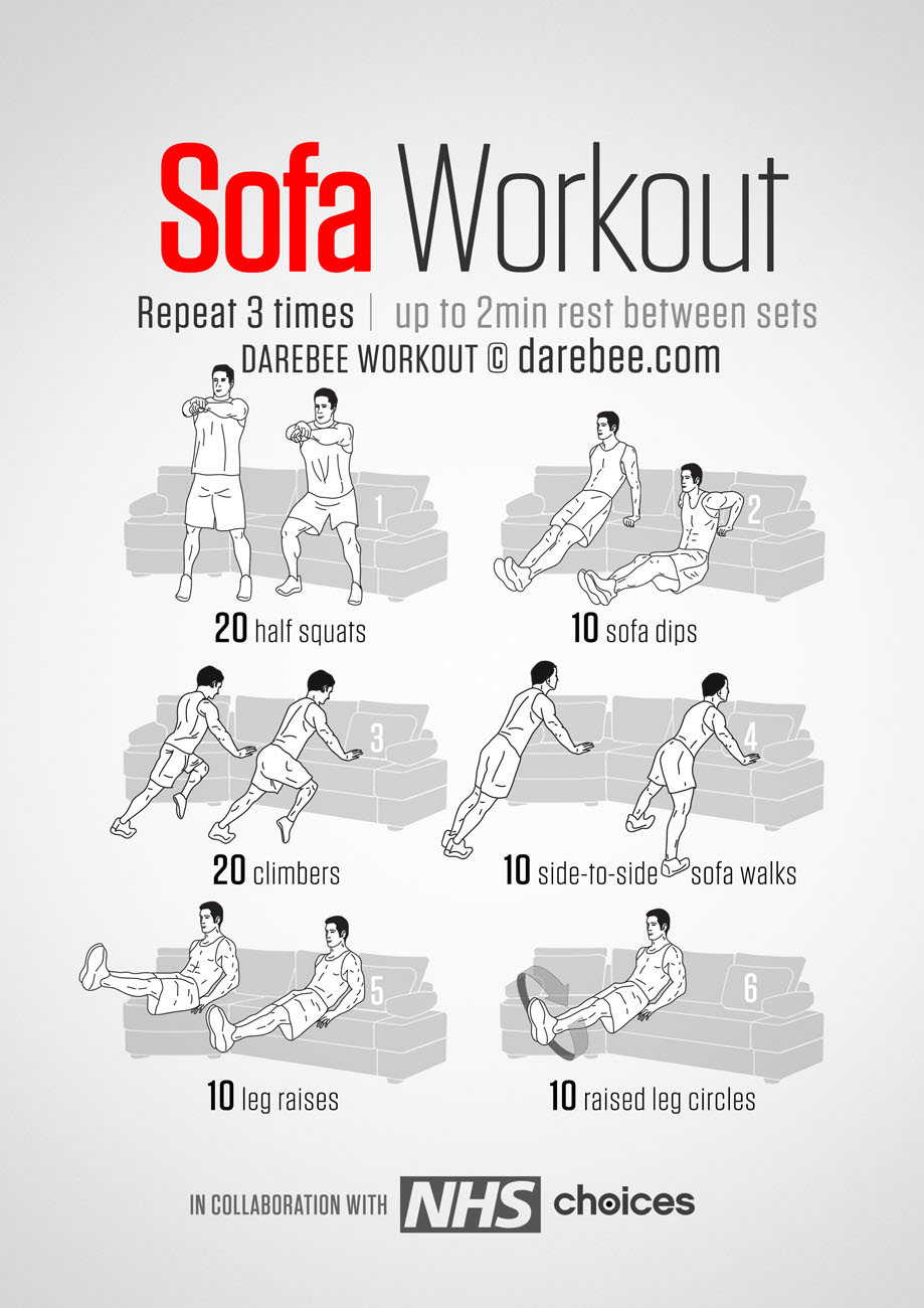 Sofa workout. Normally it isn't But a lot of us are spending quite some time on our sofas so being able to do something there is a win that's too good to miss Cozy Up is a sofa upper body workout It will stop you from getting rusty and you can do it any time Extra Credit Do it before and after watching a movie. The Cardio Sofa workout uses your sofa for something decidedly different to couching out A lower body workout with a strong aerobics component Cardio Sofa is perfect for that rainy day when you feel like going for a run but the weather is against you or when you really don't want to go into all the trouble associated with tidying yourself up so you can go outdoors. The Couch to Fit workout series is a simple sixweek program During the first week, you will complete three workouts These workouts will center around learning stretching, moving, and strength basics The second week will continue with three new workouts.
