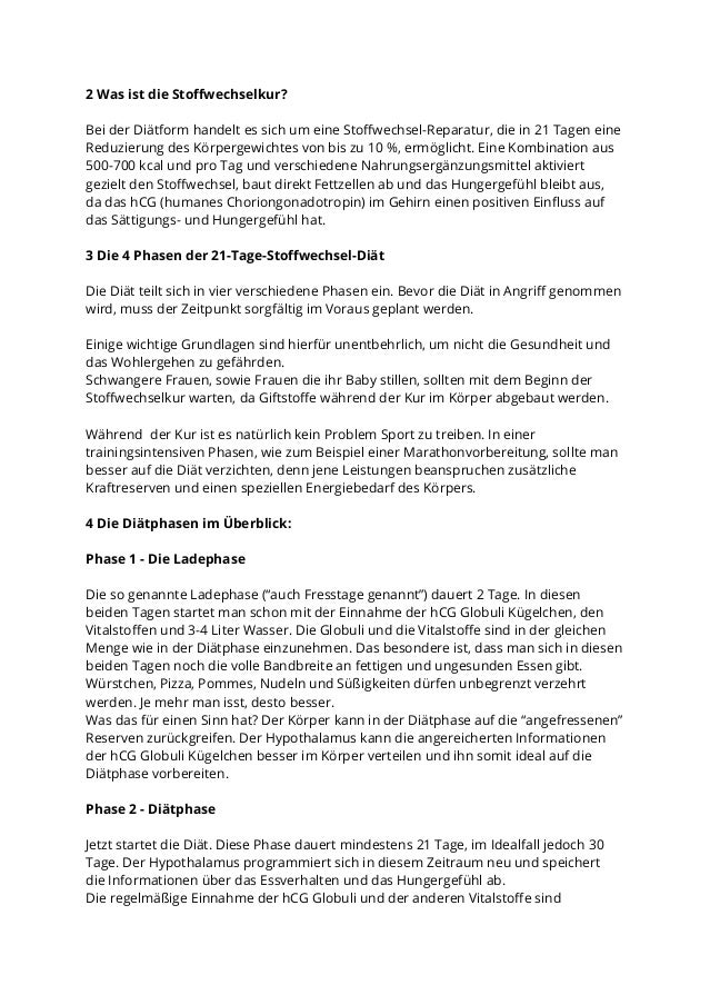 Die Stoffwechselkur ist eine Diät, die es ermöglichen soll, innerhalb von 21 en bis zu 12 Kilo abzunehmen Der Plan klingt einfach Während der Diätphase sind nur 500 Kilokalorien am erlaubt Außerdem wird das Schwangerschaftshormon HCG in Form von Globuli oder Tropfen eingenommen, um den Fettstoffwechsel anzuregen Hinzu kommen die sogenannten Vitalstoffe, also. 7 Fazit zur Stoffwechselkur. Wirksamkeit und Erfolg der 21eStoffwechselKur, insbesondere eine maßgebliche Beeinflussung des Abnehmerfolgs durch die einzunehmenden Produktbestandteile (aspartamfreies Eiweiß, Globuli und Nahrungsergänzungsmittel), sind ernährungswissenschaftlich nicht erwiesen.