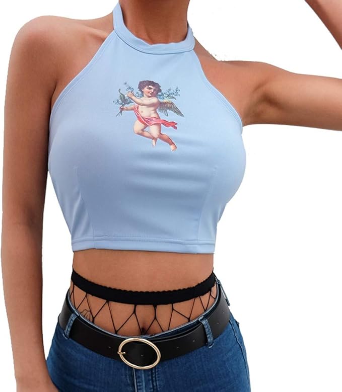 Goosuny Neckholder Top Damen Sommer T Shirt Schulterfrei Camis Crop Tops Armellose Ruckenfreies Bandeau Weste Engel Drucken Bluse Tragerloses Oberteile Fur Sport Amazon De Bekleidung