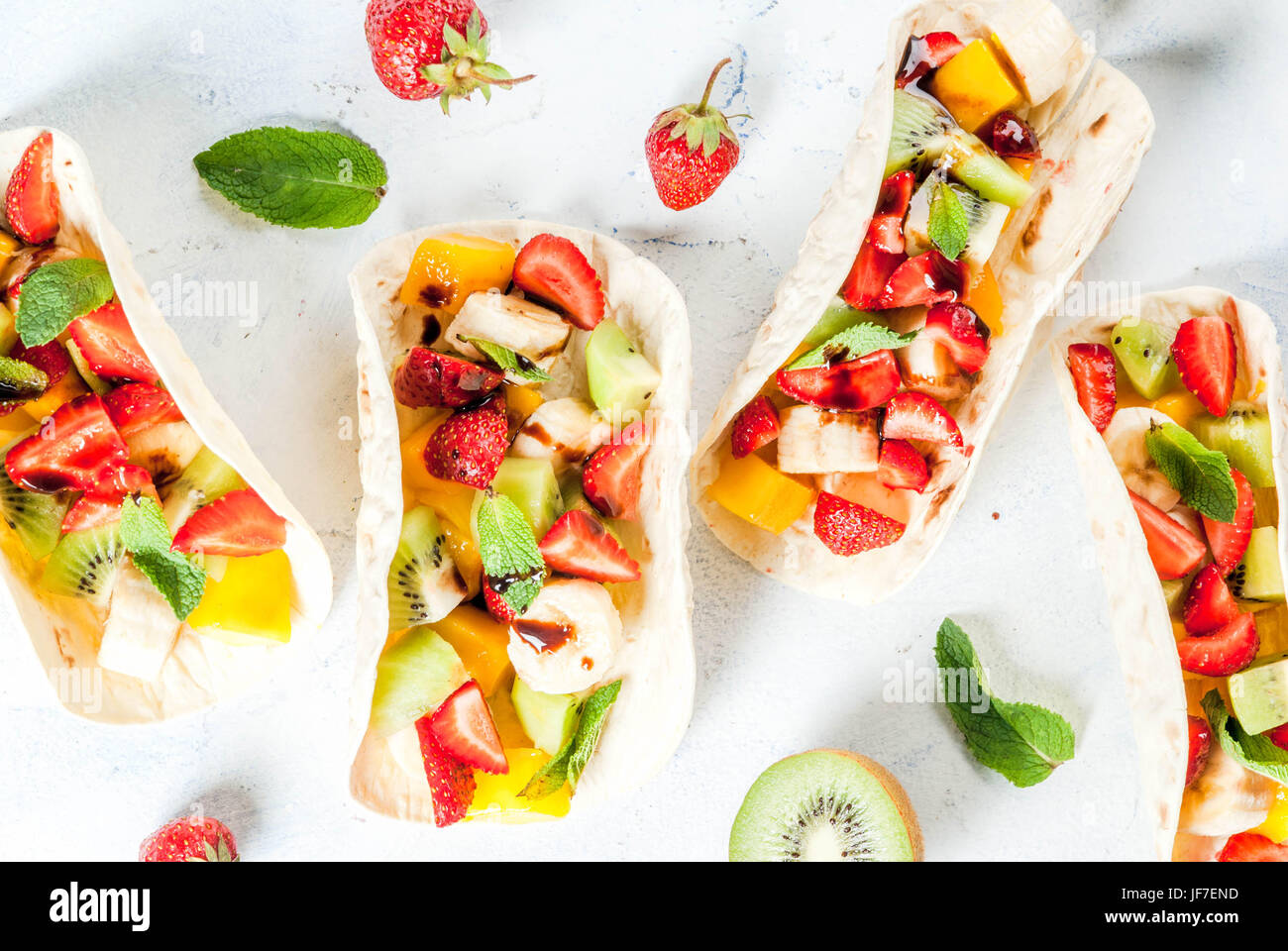 Sommer Snacks Essen Fur Eine Party Fruchttacos Mit Erdbeeren Mangos Bananen Schokolade Minze Auf Einem Hellblauen Betontisch Kopie Raum Draufsicht Lizenzfreie Fotos Bilder Und Stock Fotografie Image