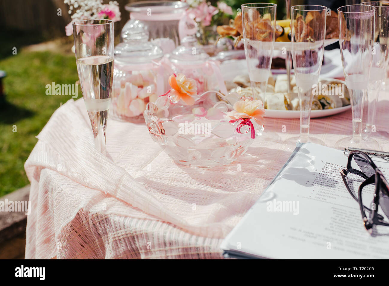 Sussigkeiten Sussigkeiten In Den Glasern Pink Dekor Auf Tisch Draussen Im Sommer Party Tisch Mit Essen Canapes Snacks Planung Partei Notebook Und Stockfotografie Alamy