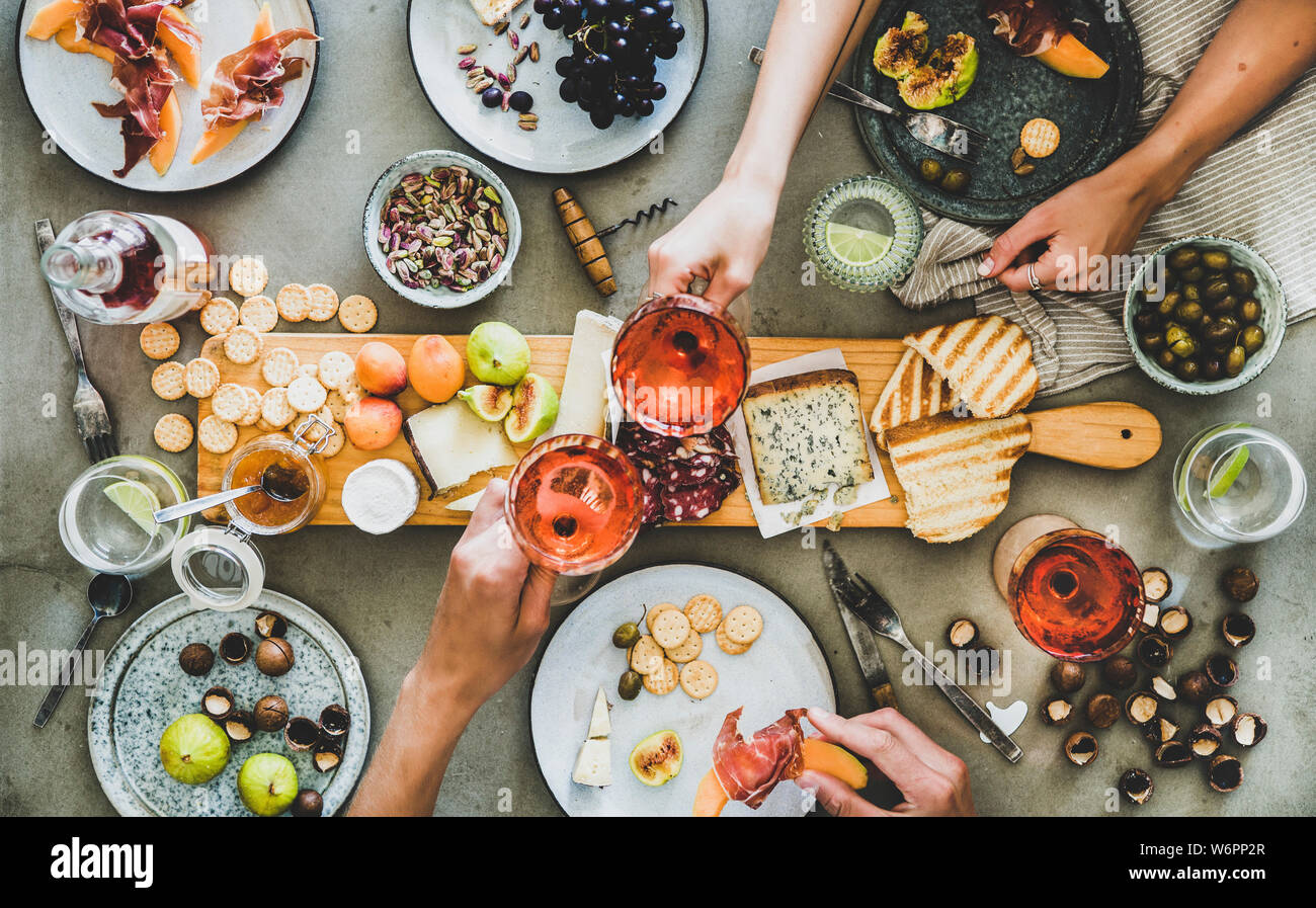 Saisonale Mitte Sommer Picknick Oder Party Mit Wein Und Snacks Flachbild Lay Von Wurst Und Kaseplatte Mit Verschiedenen Vorspeisen Rose Wein Nusse Oliven Ein Stockfotografie Alamy