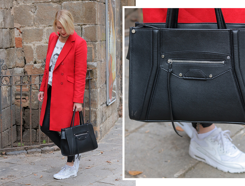 Fashionblogger Barceona Roter Mantel H M Tasche Nike Air Max Justin Bieber Shirt Skinny Jeans Schwarz 4 Lavie Deboite
