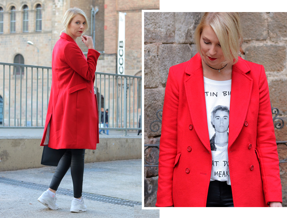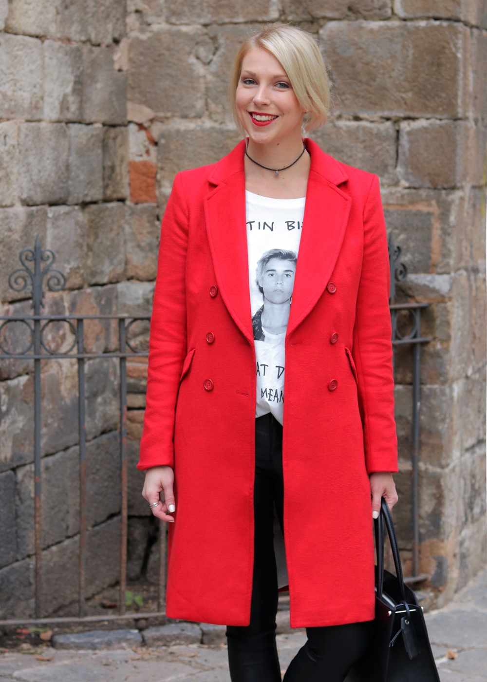 Fashionblogger Barceona Roter Mantel H M Tasche Nike Air Max Justin Bieber Shirt Skinny Jeans Schwarz 5 Lavie Deboite