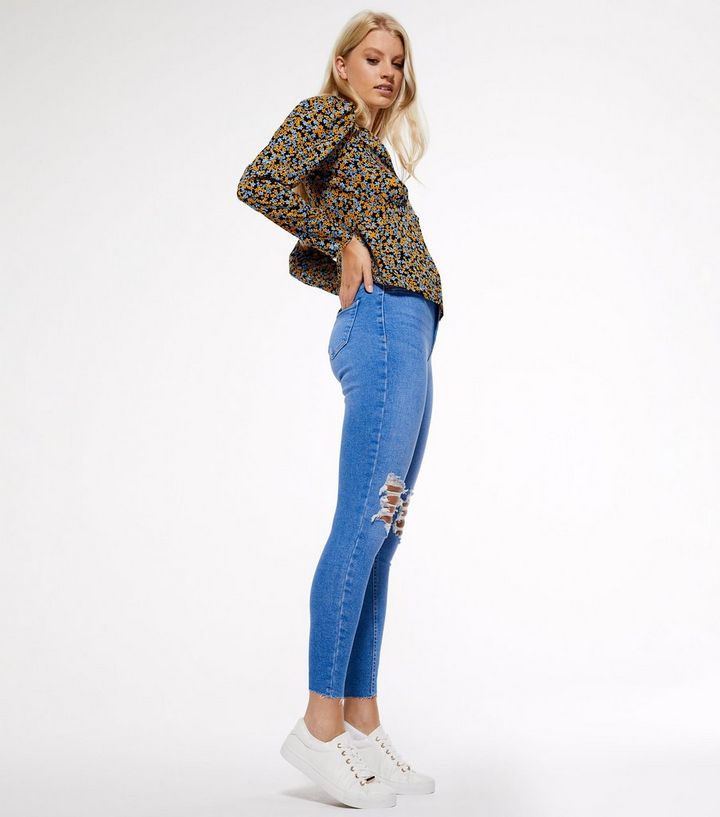 Girls Mid Blue Ripped High Waist Super Skinny Jeans New Look From New Look On 21 Buttons