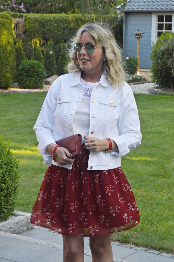 Weisse Jeansjacke Roter Minirock Weisse Stiefeletten Ari Sunshine