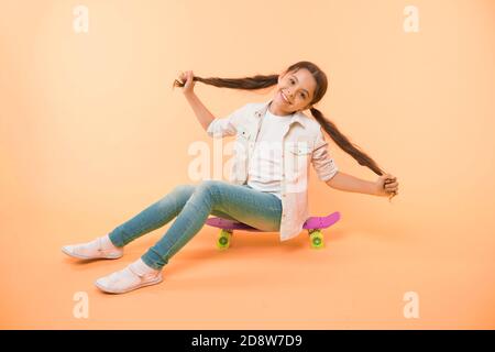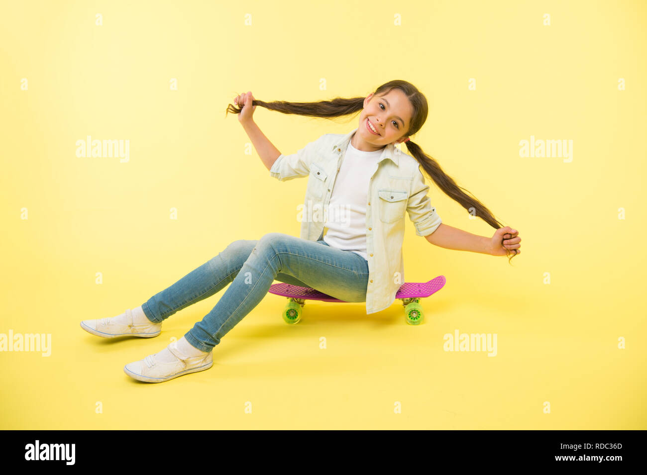 Madchen Zeigen Langen Pferdeschwanz Frisur Sitzen Penny Board Gelben Hintergrund Kind Niedlich Frisur Fahrt Penny Stolz Auf Lange Haare Frisur Fur Aktive Freizeit Frisur Ordentlich Beim Sport Halten Stockfotografie Alamy
