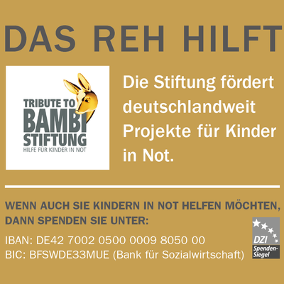 Fundraiser by TRIBUTE TO BAMBI Stiftung €30 / €1,000 4 people donated December 1, at 0 AM · Public 1 Comment · Full Story BAMBI Na am Sonntag noch nichts vor?. Die Tribute to BambiStiftung fördert seit 06 ganzjährig Kinder und Jugendhilfsprojekte in Deutschland und macht auf Schicksale und gesellschaftliche Missstände aufmerksam Ziel ist es, notleidenden Kindern konkret und nachhaltig zu helfen und dazu beizutragen, dass sich ihre Situation langfristig verbessert. TRIBUTE TO BAMBI Stiftung Arabellastrasse 23 München 49 9250 2475 post@tributetobambistiftungde.