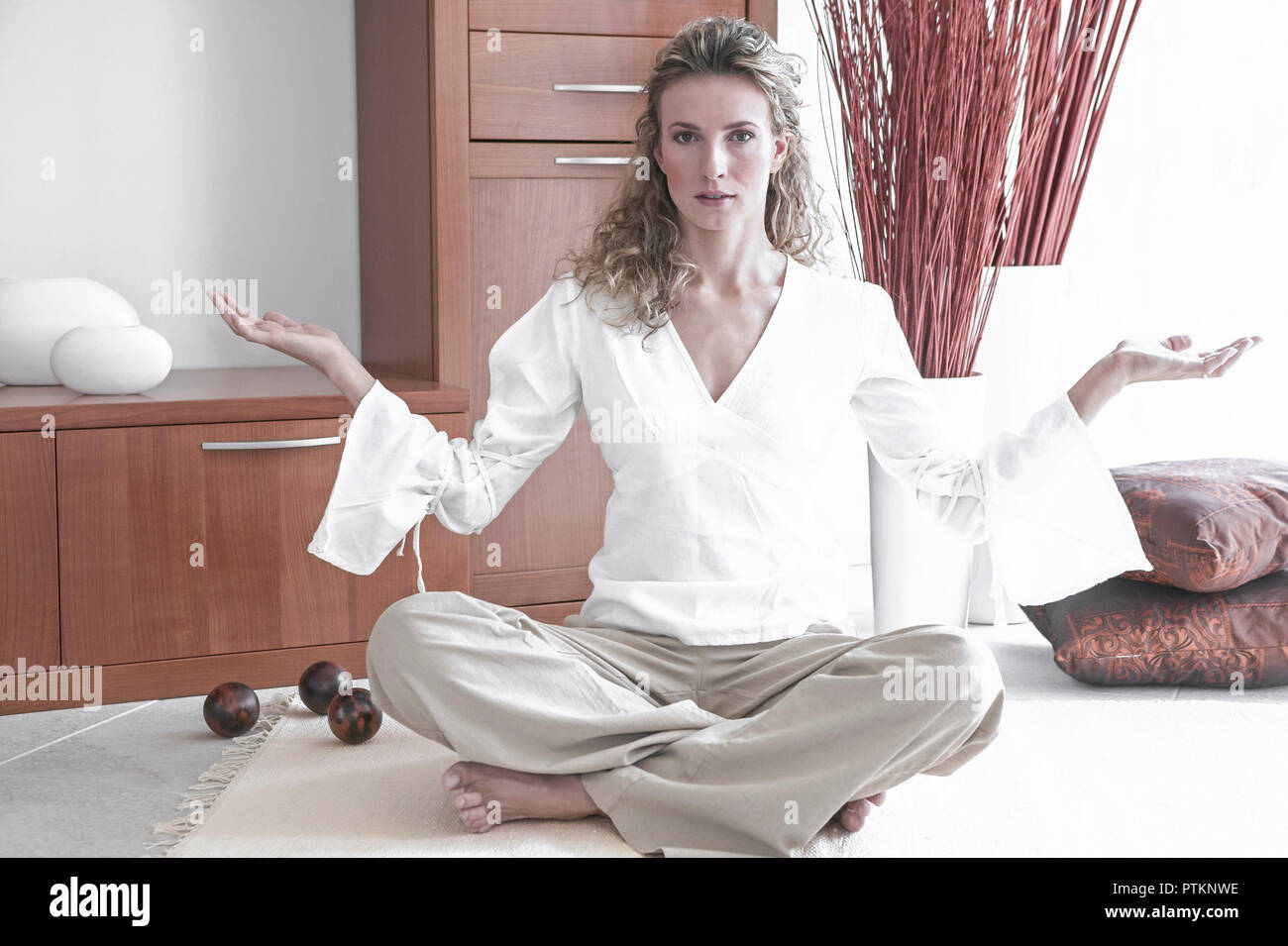 Wohnzimmer Frau Jung Sitzen Meditieren Lotussitz Femmes Innen Zuhause Meditation Yoga Entspannen Entspannung Sich Gehen Sitzen En Boden Relaxen Modell Photo Stock Alamy